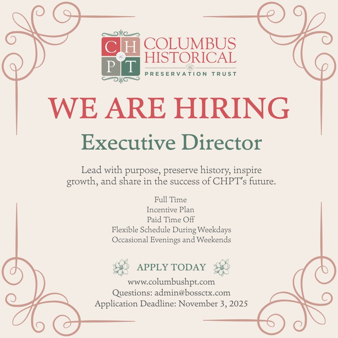 In partnership with the Nesbitt Memorial Library, CHPT will host the annual History Forum on Tuesday, November 12, 2024. The forum will be held in the Buddy Rau Room of the Stafford Opera House starting at 6:00 p.m. This year’s topic is Photography of Columbus: Past and Present and will feature the newly released Seasons of Colorado County photo book published by CHPT and the soon to be released Live Oaks and Dead Folks: Tales and Images from the Nesbitt Memorial Library Cemetery Tour published by the Nesbitt Memorial Library.